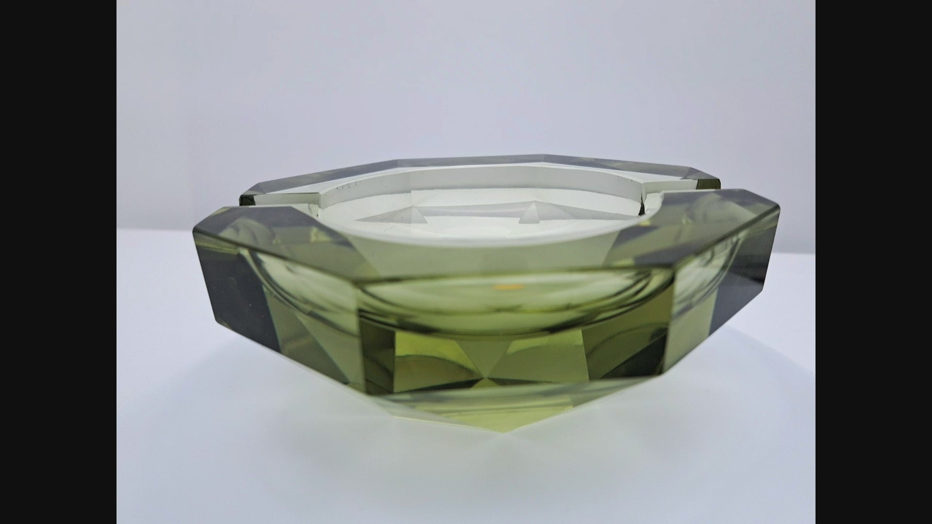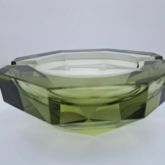 Il protagonista assoluto è il vetro: pesante e limpido, declinato in una sofisticata tonalità verde oliva. La forma ottagonale è scolpita da profonde sfaccettature che catturano e moltiplicano i riflessi, creando giochi di luce affascinanti ad ogni angolazione.