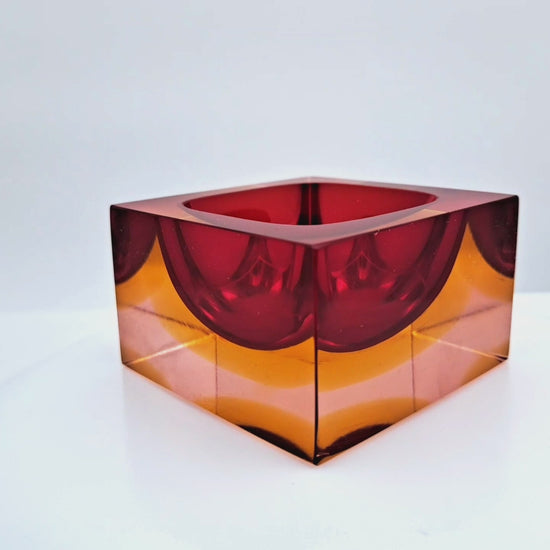 La tecnica consiste nell'immergere strati di vetro colorato uno dentro l'altro: qui vediamo un cuore rosso intenso avvolto da uno strato giallo ambra, il tutto incapsulato in un blocco finale di cristallo trasparente. Il risultato è un oggetto dalla forma geometrica rigorosa (cubica o quadrata) che però inganna l'occhio, facendo sembrare i colori sospesi nel nulla senza mescolarsi.