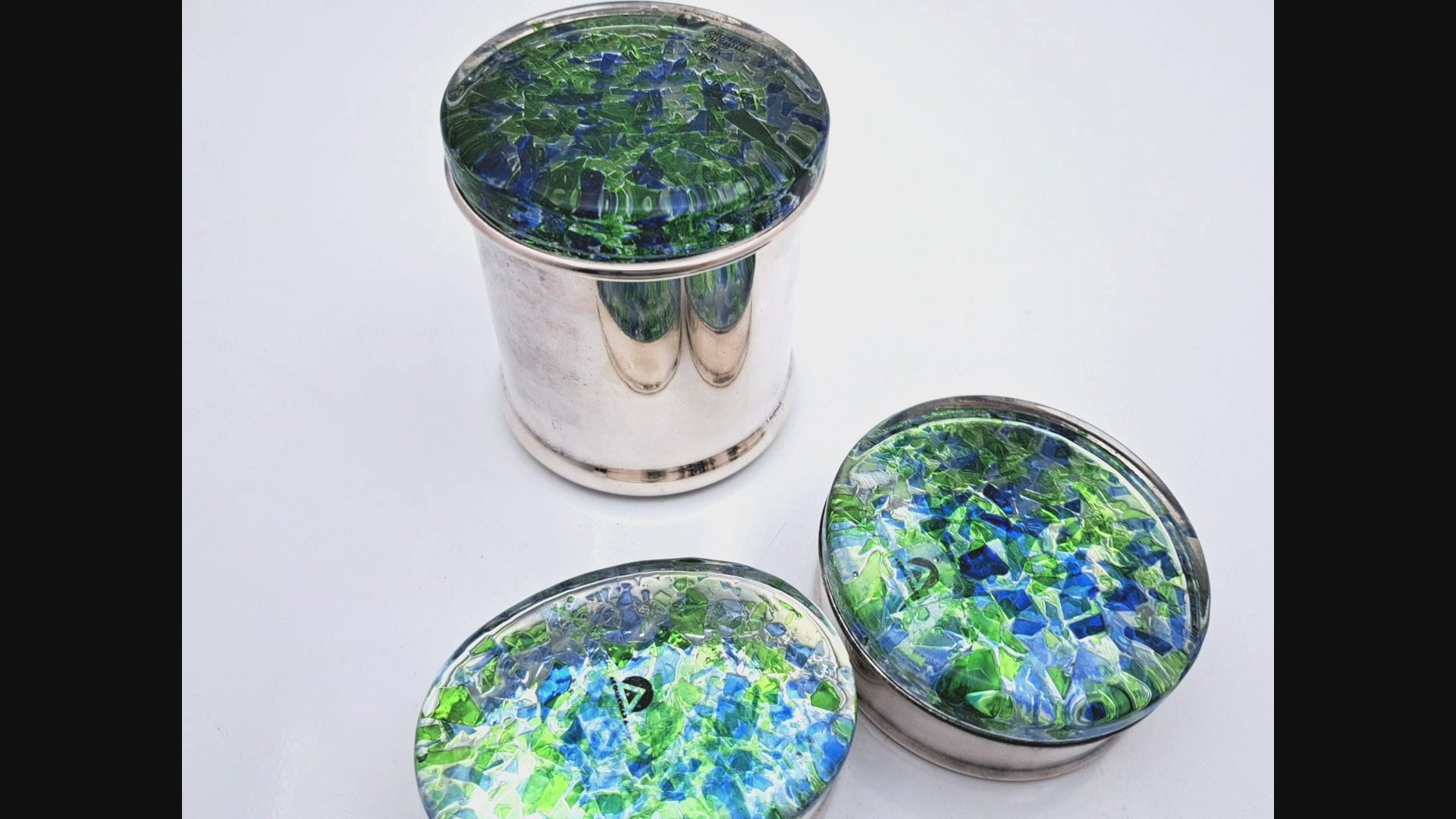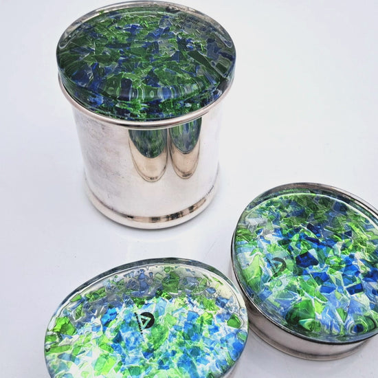 La base di ogni contenitore è realizzata in metallo silver plated (argentato), conferendo solidità ed eleganza all'oggetto. La vera protagonista è però la superficie dei coperchi: una lavorazione in vetro artistico che ricorda un mosaico o una graniglia di pietre preziose, in cui frammenti nei toni del blu cobalto, verde smeraldo e trasparente si fondono creando giochi di luce vibranti.